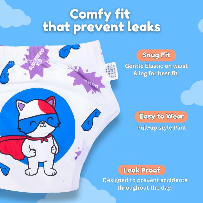 Our training pants are made from soft, breathable, and absorbent cotton with a waterproof lining to prevent leaks while keeping your child comfortable.